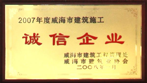 公司連續(xù)八年榮獲威海市“誠(chéng)信開(kāi)發(fā)企業(yè)”、“建筑施工誠(chéng)信企業(yè)”,連續(xù)九年被評(píng)為威海市級(jí)“守合同重信用企業(yè)”,多次被評(píng)為威海市“市級(jí)文明單位”、“質(zhì)量管理先進(jìn)企業(yè)”、 “安全管理先進(jìn)企業(yè)”,乳山市“優(yōu)秀企業(yè)”、“先進(jìn)民營(yíng)企業(yè)”、“納稅明星企業(yè)”,在社會(huì)上逐步樹立了誠(chéng)信、穩(wěn)健的企業(yè)形象。